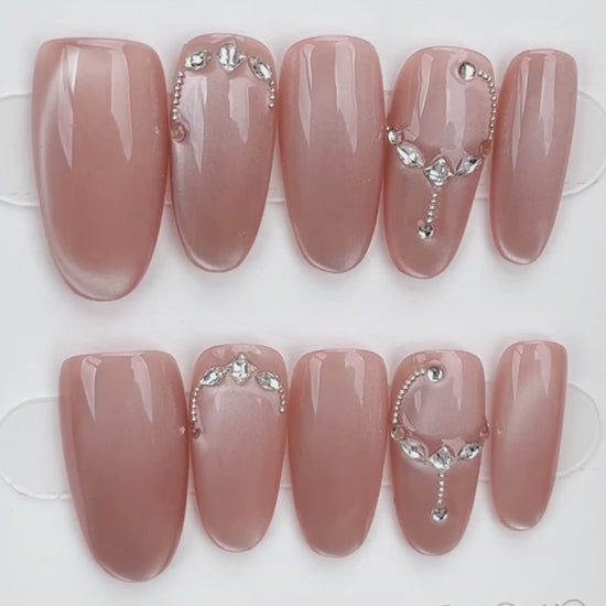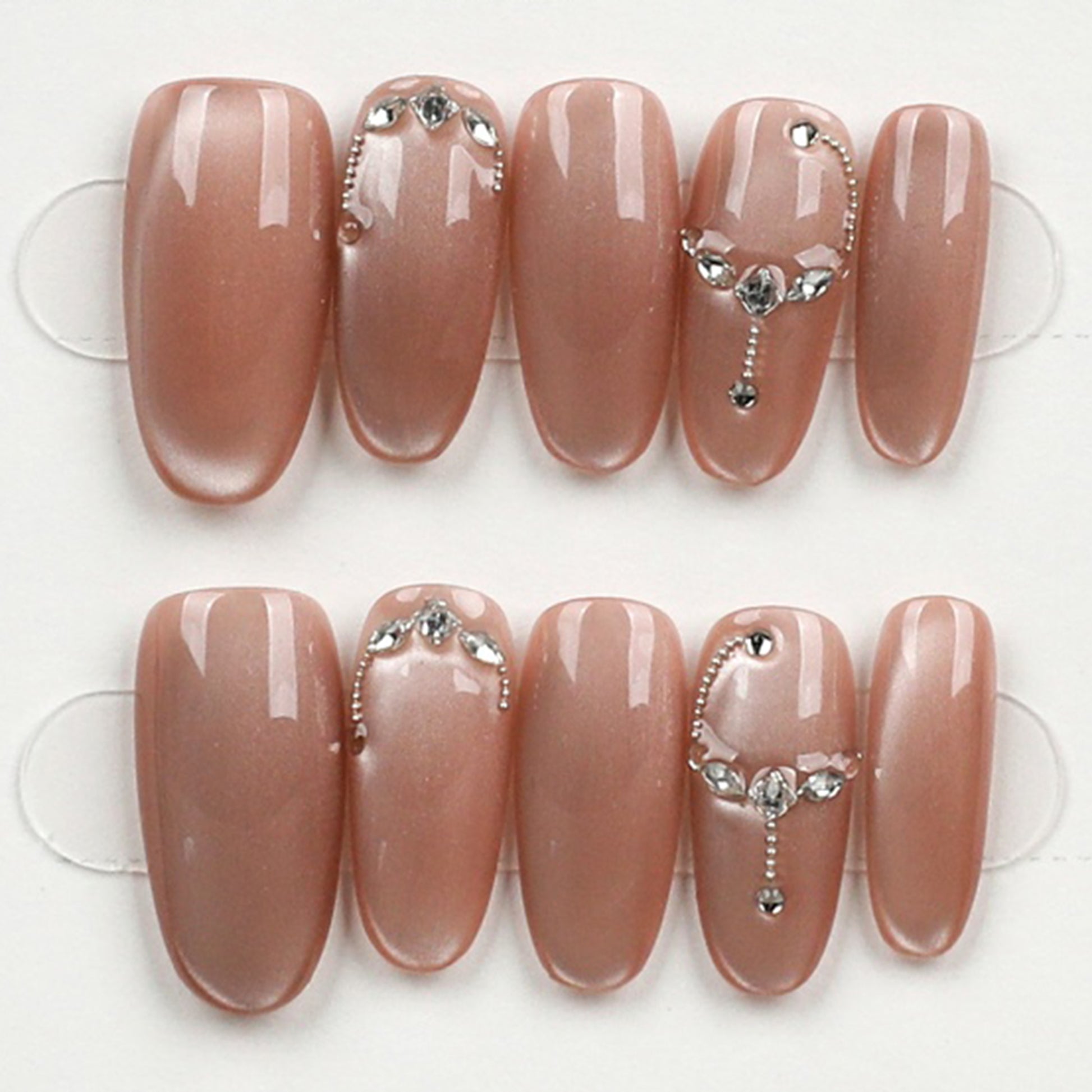 Effortlessly elegant and perfect for every occasion, the Champagne Charm Press-On Nail Set features a glowing nude base with a satiny sheen. Crystal accents and delicate rhinestone chains add a touch of glam, while the subtle shimmer finish gives a refined, polished look that's both timeless and modern. These nails are your go-to for instant sophistication without the salon time.