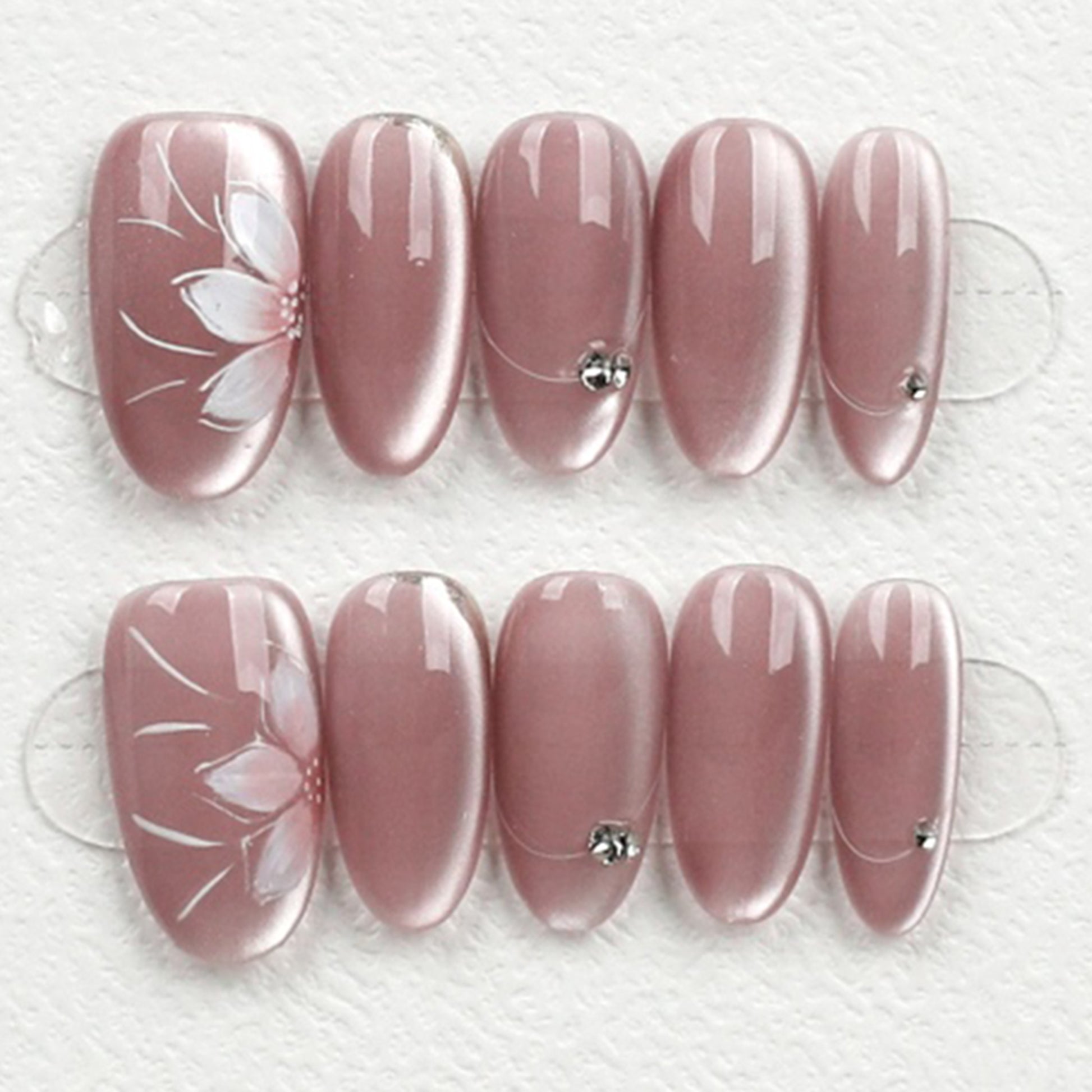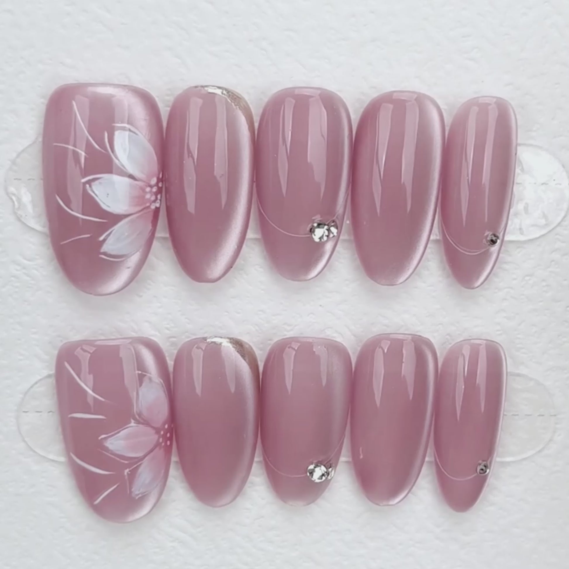 Step into elegance with the Dusty Blossom Petal Press-On Nail Set. These soft mauve-pink nails are touched with delicate hand-painted white petals and tiny rhinestones that catch the light with every move. The semi-sheer shimmer gives your fingertips a soft-focus glow — like a fresh bloom at golden hour.