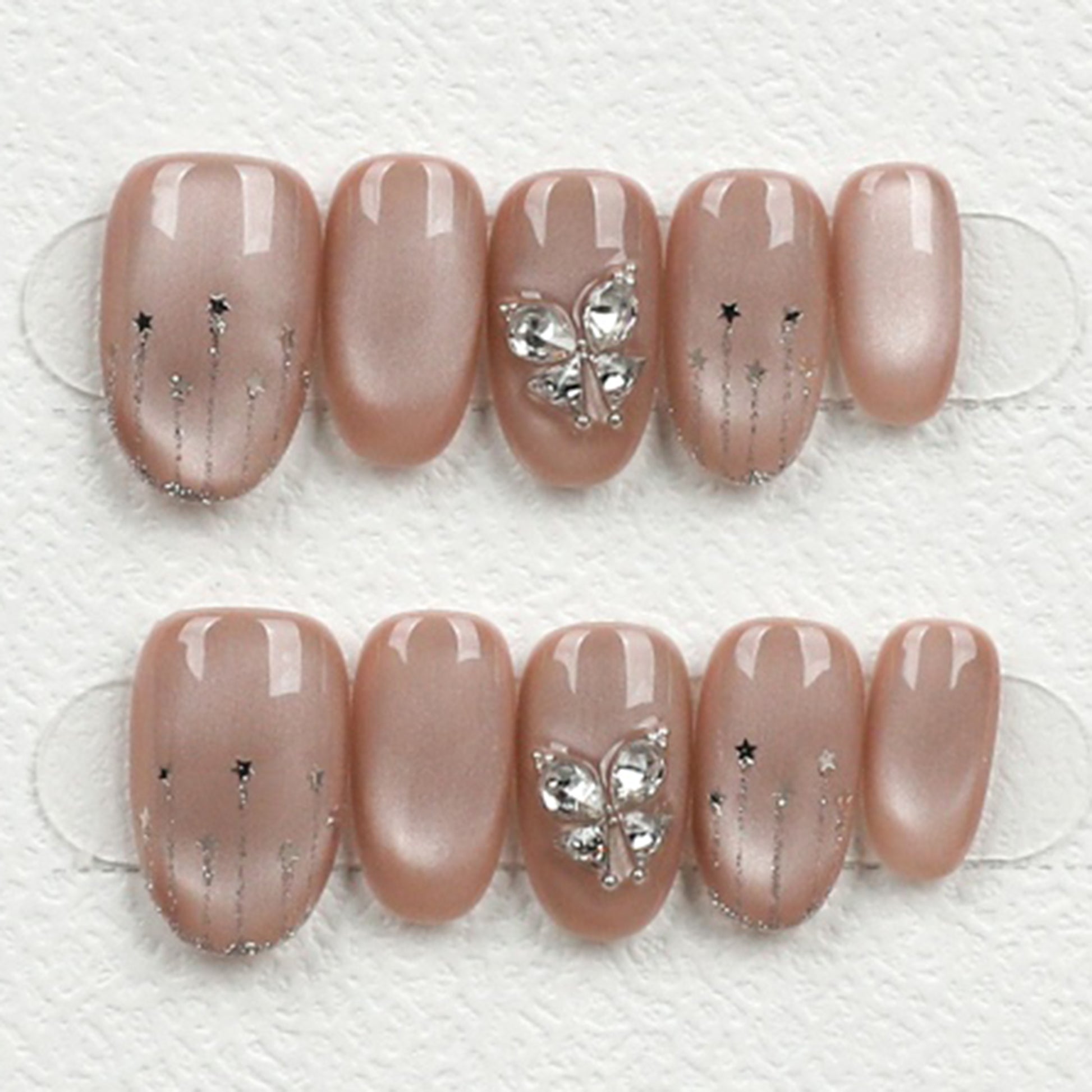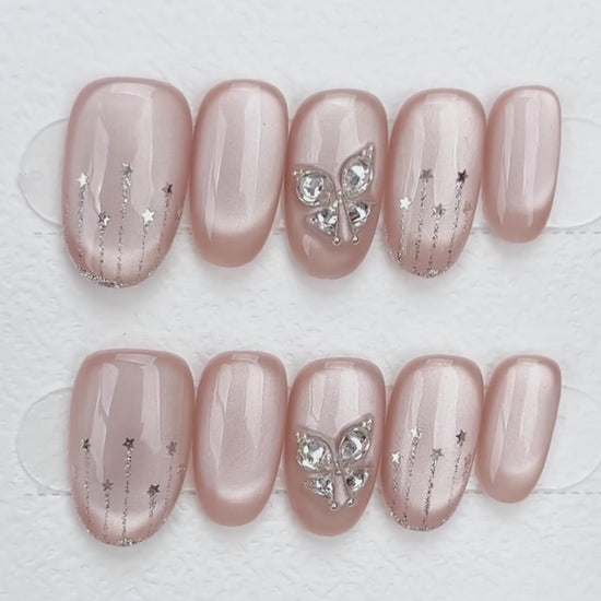 Soft champagne shimmer meets delicate celestial sparkle in our Twilight Stardust Butterfly Press-On Nail Set. Adorned with rhinestone butterflies and glittery star trails, this elegant design radiates quiet luxury and whimsy. The perfect balance between subtle glow and standout charm.