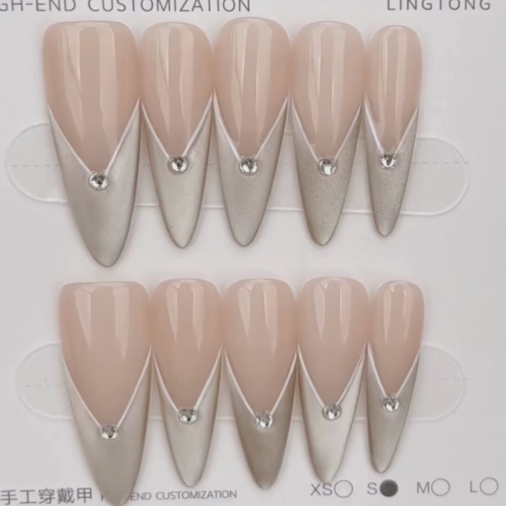 💅 Style Code: L0385-A 🎨 Color: Nude blush with silver accents 💎 Finish: Glossy with metallic detailing and rhinestones 📐 Shape: Almond 📏 Size: (XS•S•M•L)