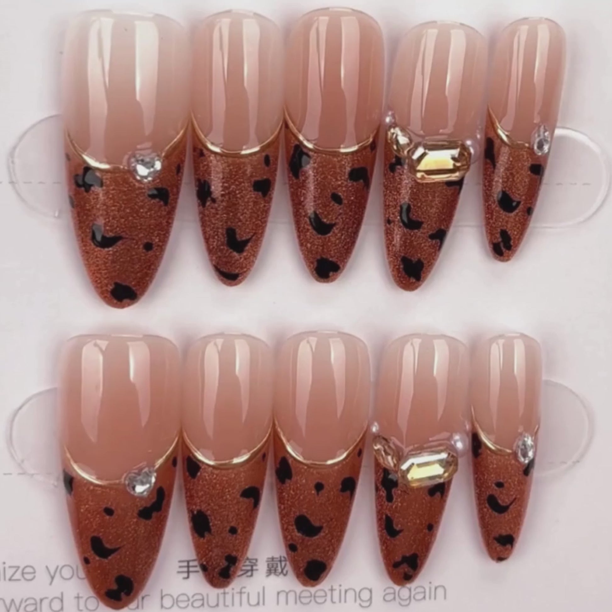 💅 Style Code: H0126-E 🎨 Color: Nude, bronze, black 💎 Finish: Glossy with glitter and rhinestones 📐 Shape: Stiletto 📏 Size: XS•S•M•L