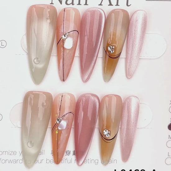 An elegant fusion of champagne nude, blush shimmer, and translucent marble swirls, the Amber Mist Marble Press-On Nail Set radiates modern femininity. With almond-to-stiletto length, its graceful gradient design is accented with delicate linework, mini rhinestones, and opalescent stones — giving you that editorial-glam finish with wearable versatility.