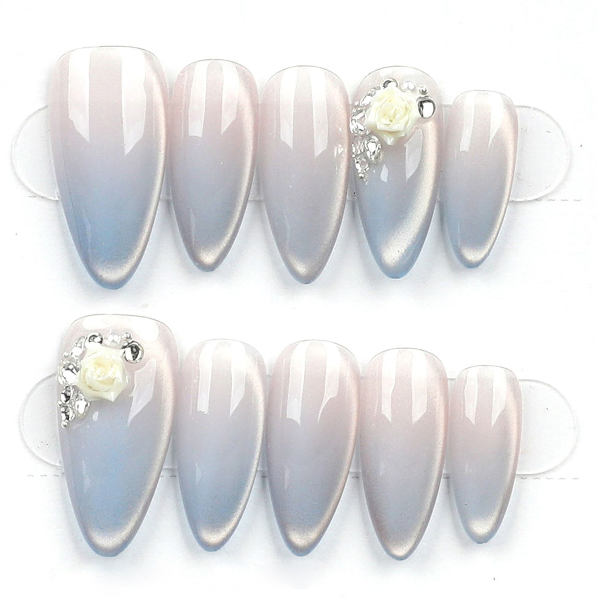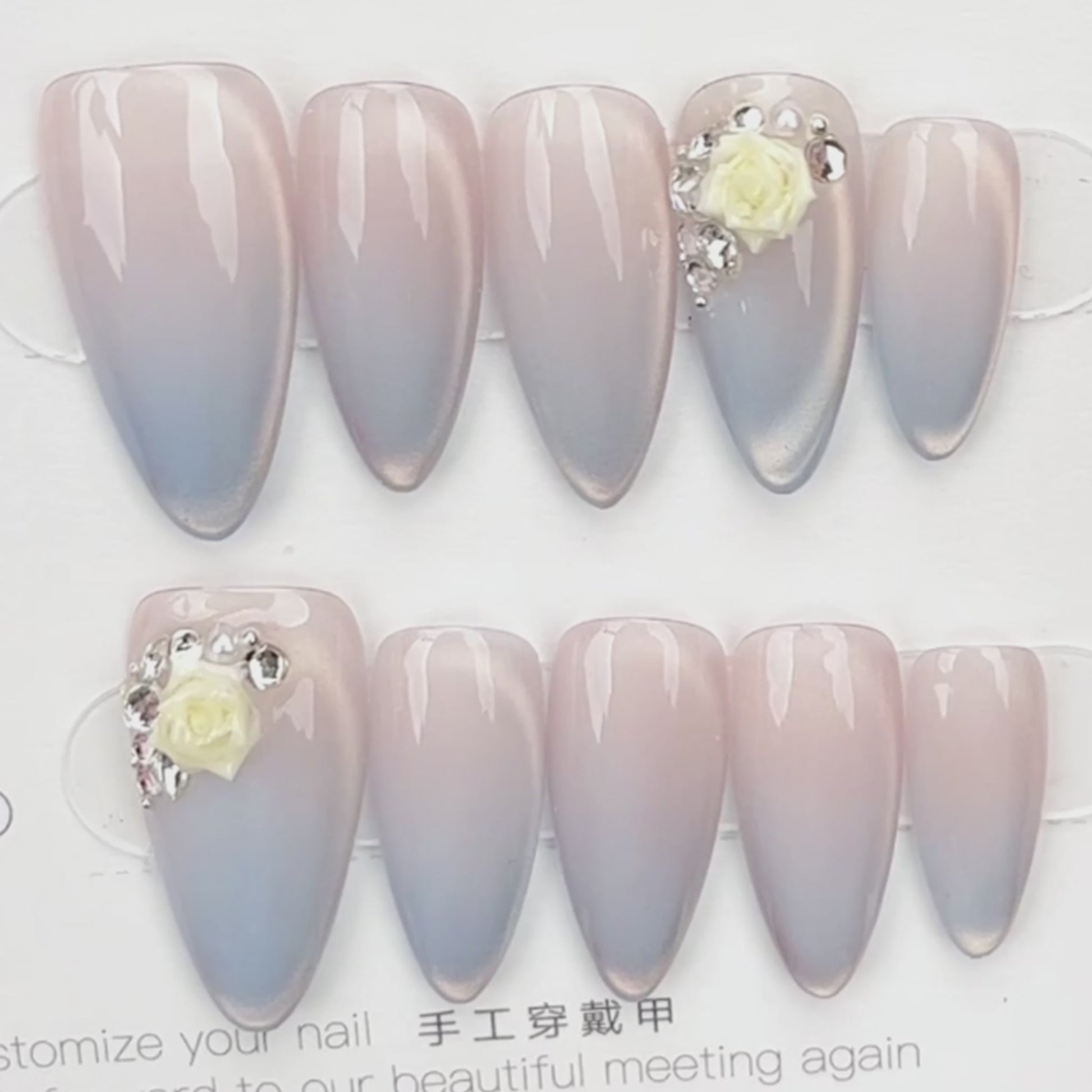 A soft fairytale finish with a touch of bridal beauty 💍 Our Powder Blue Rose Frost Press-On Nail Set features a dreamy ombré shift from icy pearl to frosty blue, complete with a 3D ivory rose and crystal cluster for a look that's elegant, romantic, and utterly enchanting.