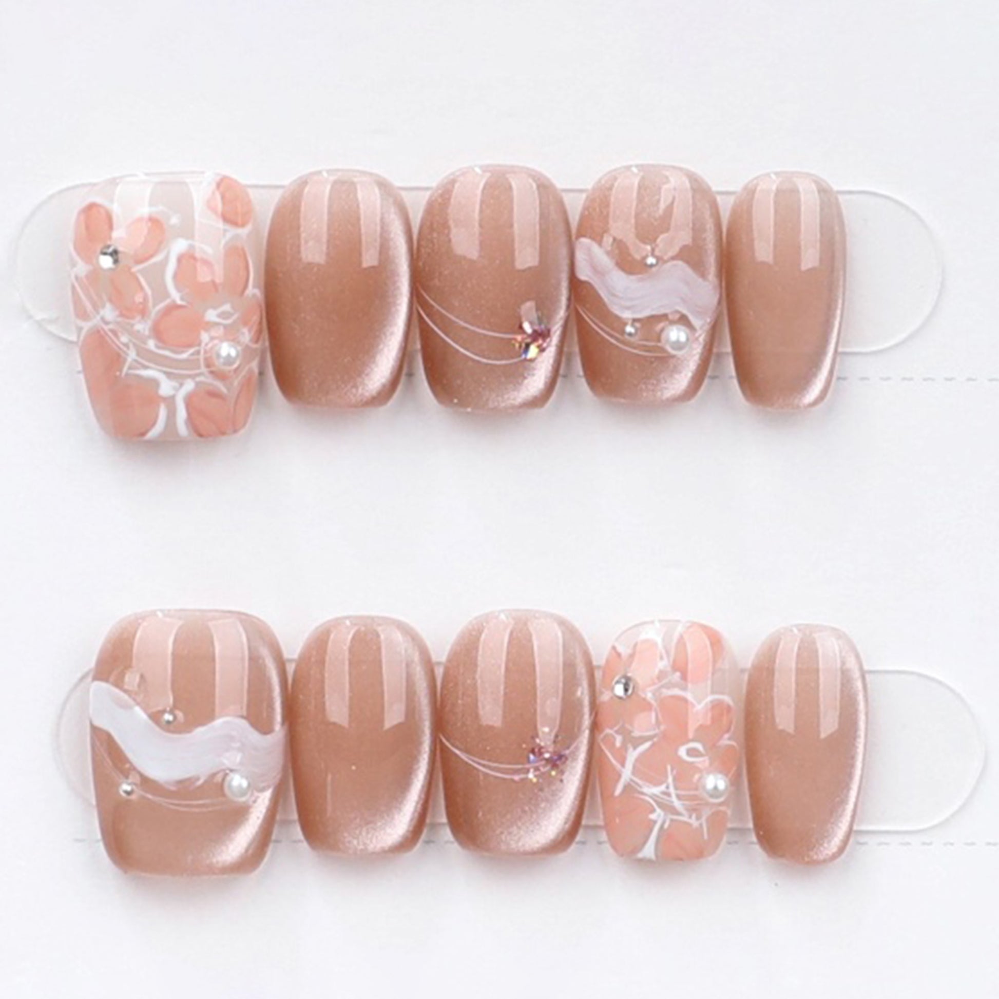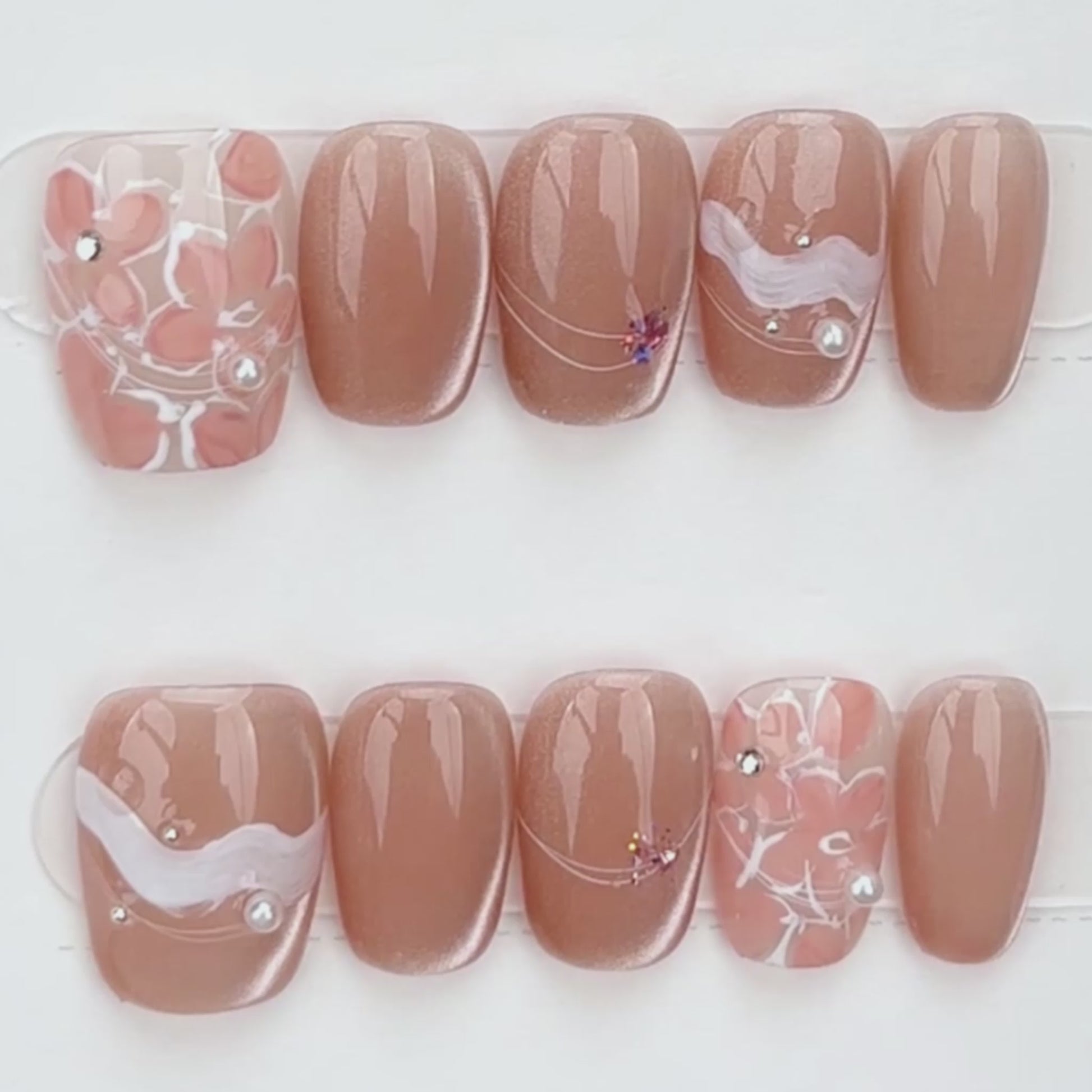 Fall in love with the soft elegance of Coral Bloom Breeze — a peachy-toned dream set that blends warm coral floral art with sleek champagne shimmer. Featuring pearl accents, microcrystals, and flowing white wave lines, this design offers the perfect balance of sophistication and whimsy for everyday wear or special moments.