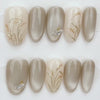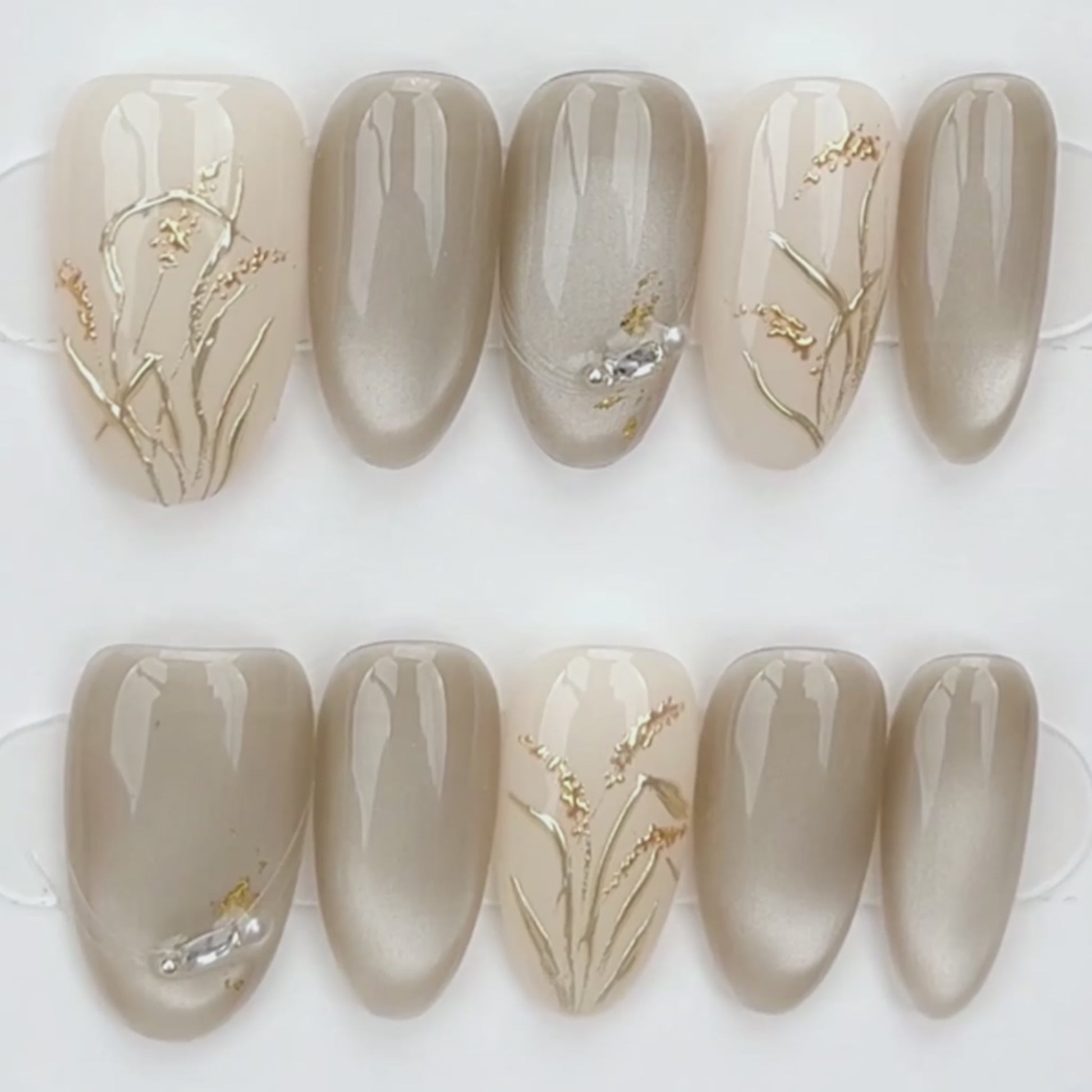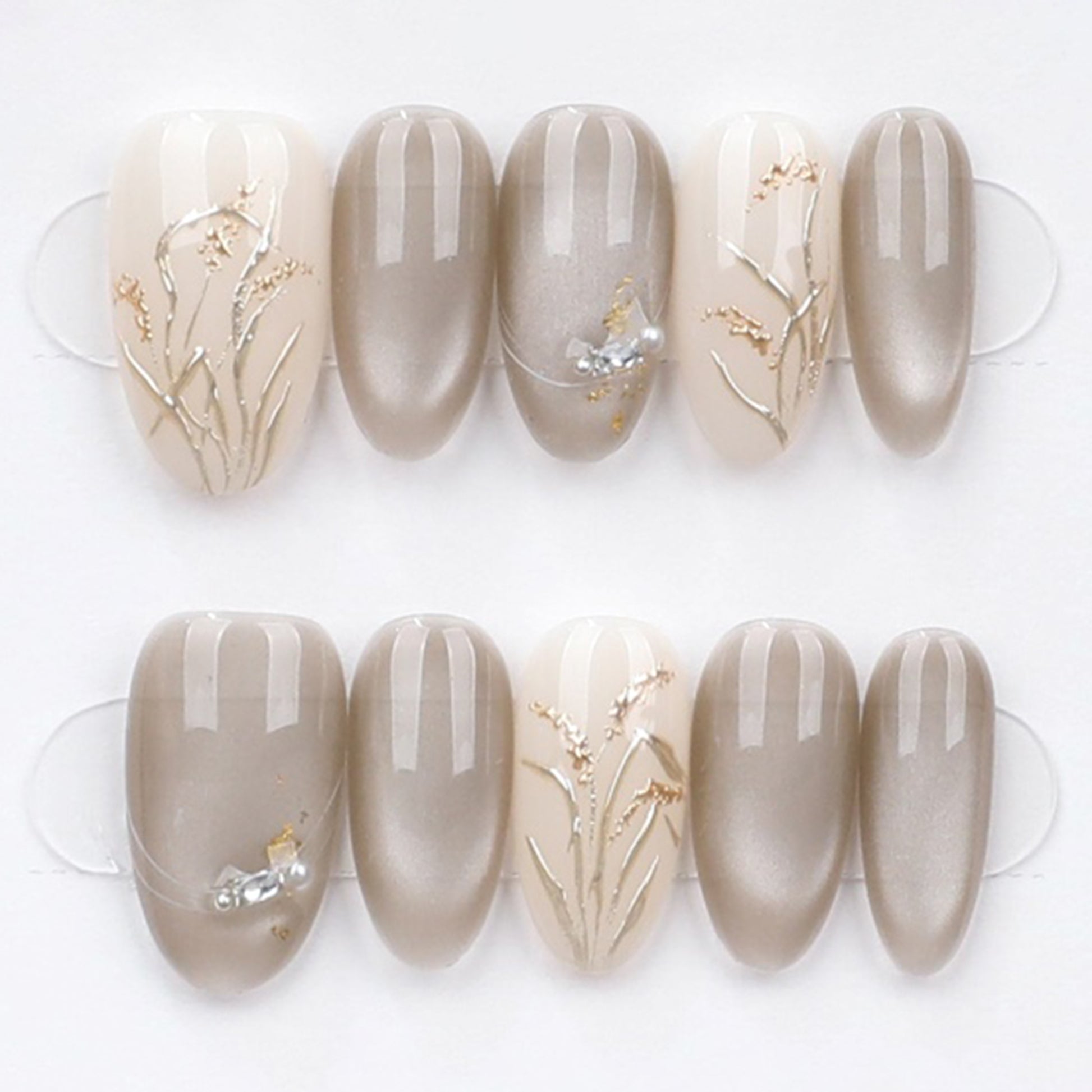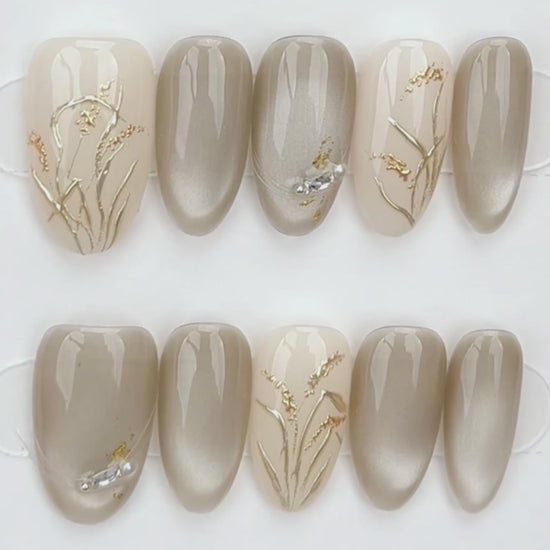 Radiate elegance with our Golden Dusk Bloom Press-On Nail Set — a luxurious blend of champagne shimmer and floral artistry. Featuring silky beige tones, luminous glitter accents, and delicate white floral designs with metallic gold foil, this set brings a soft, romantic glow to your fingertips. Ideal for weddings, brunch dates, or any occasion where you want to feel effortlessly refined.