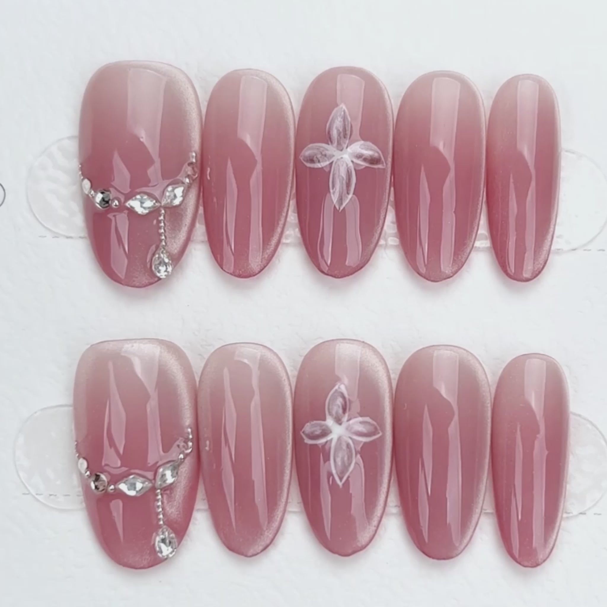 A flawless blend of soft rose shimmer and crystal accents, the Rose Velvet Gem Press-On Nail Set adds understated glam to your fingertips. Adorned with delicate rhinestone chains and petal-like gems, this romantic set is perfect for dinner dates, weddings, or just feeling extra beautiful.