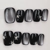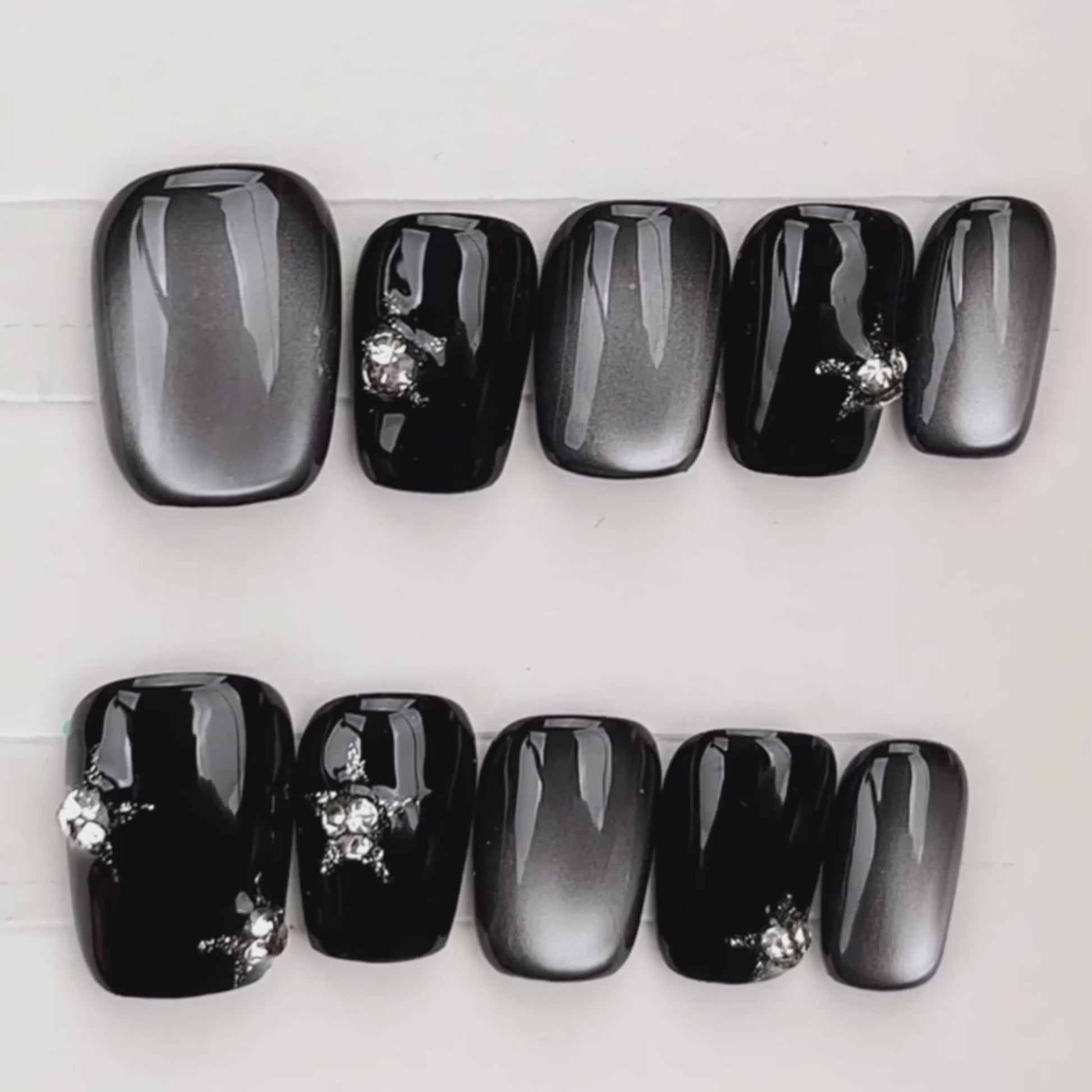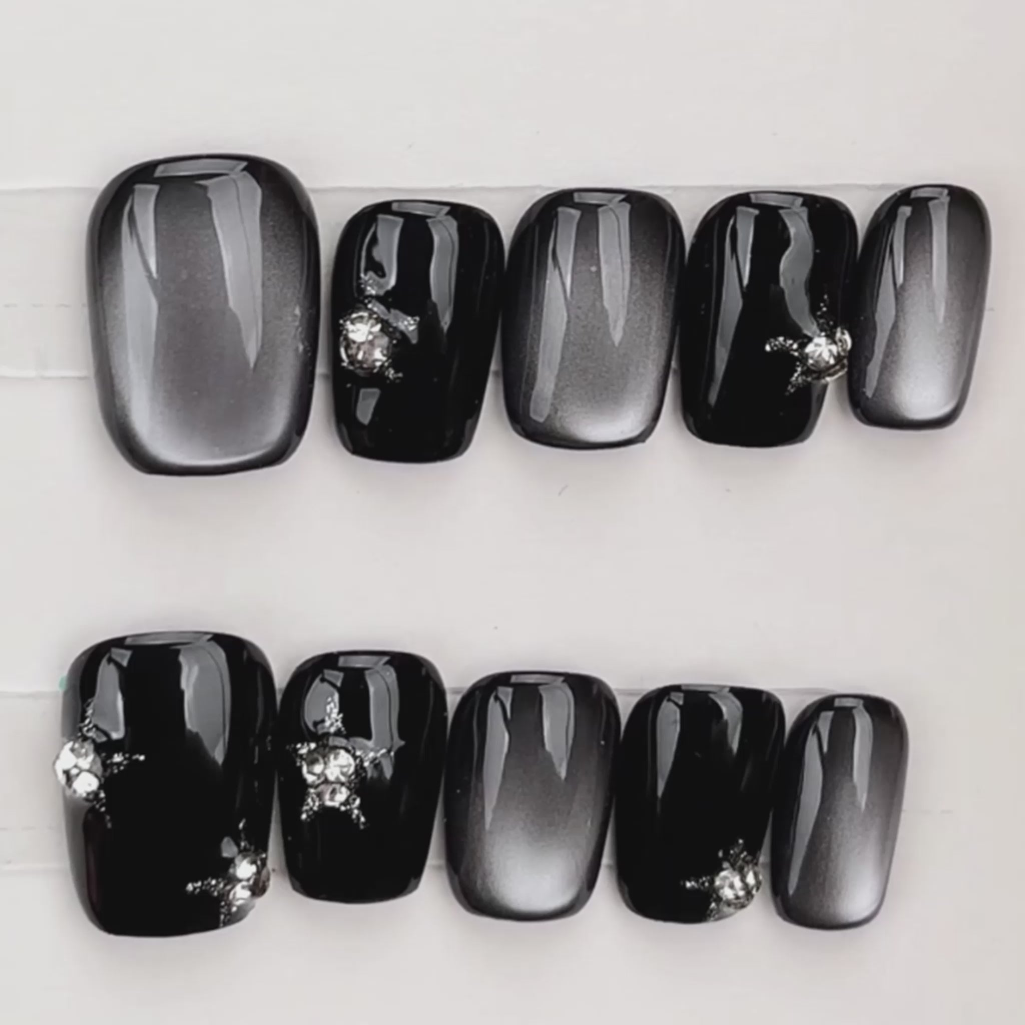 Soft yet striking, Midnight Halo features a mesmerizing black cat-eye gradient with magnetic shimmer and dazzling crystal accents. These press-ons are for the confident — a luxe look that shifts subtly in the light and sparkles with every gesture.