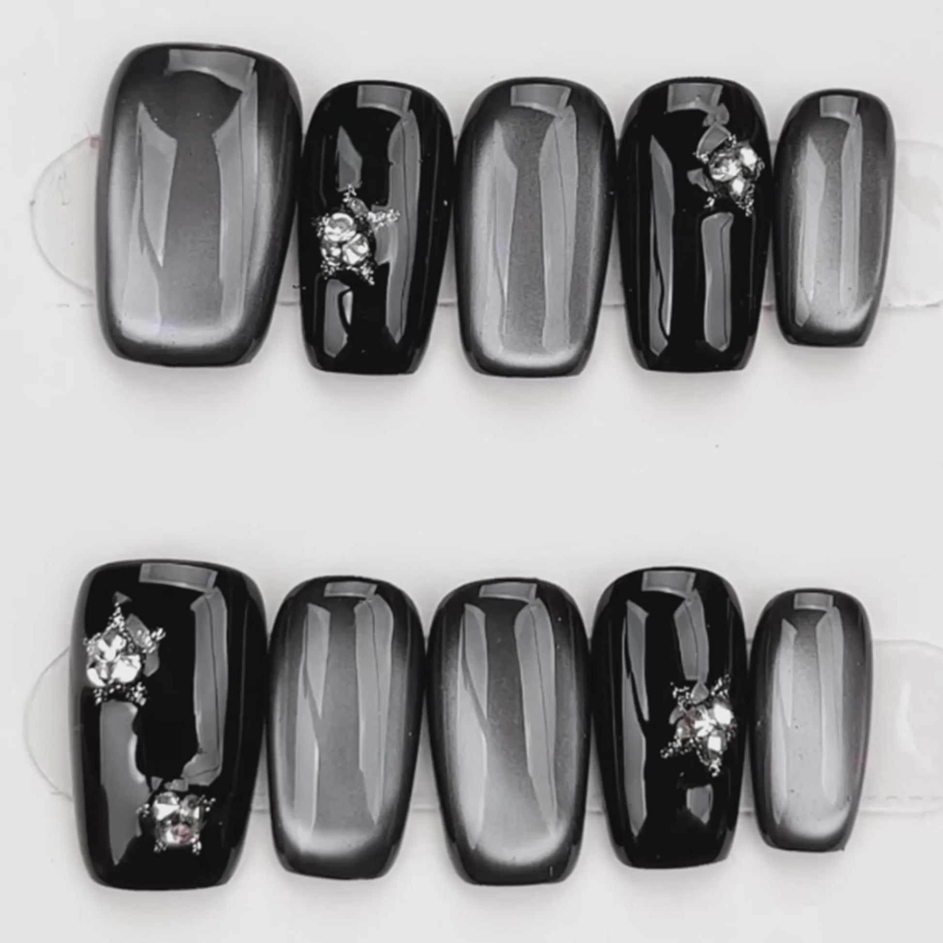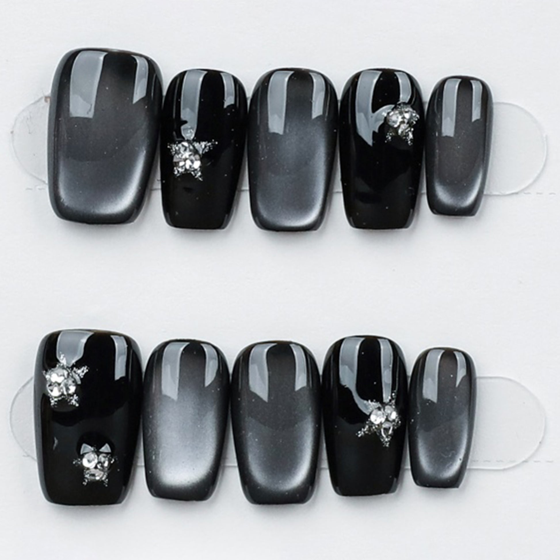 Step into the night with Midnight Starlight Press-On Nail Set — a deep black cat-eye base paired with a cosmic shimmer that shifts under the light. Accented with tiny silver crystals and a velvet magnetic gradient, this set adds bold elegance to any look, making it perfect for glam nights out or dramatic everyday wear.