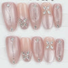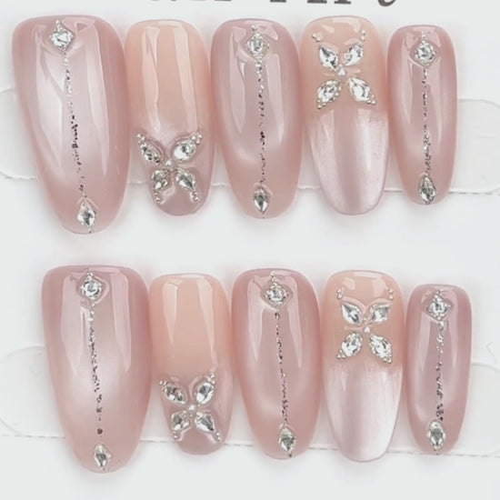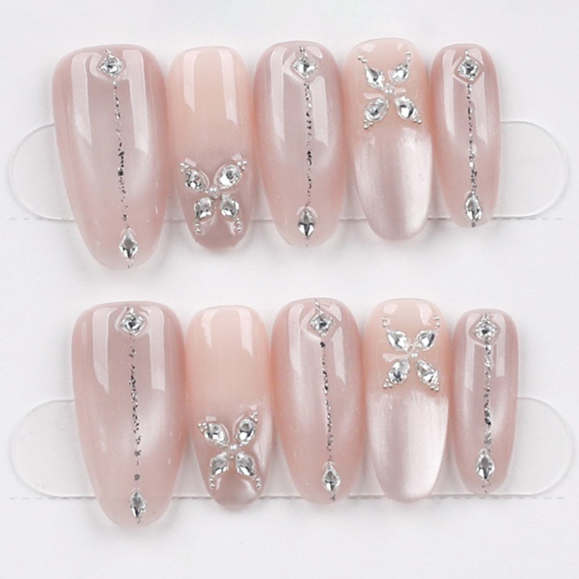 A delicate and romantic touch for your fingertips — this blush-toned press-on nail set features silver rhinestone butterflies, vertical glitter striping, and a soft pearlescent finish. The perfect choice for a bridal moment or a feminine everyday glow.