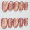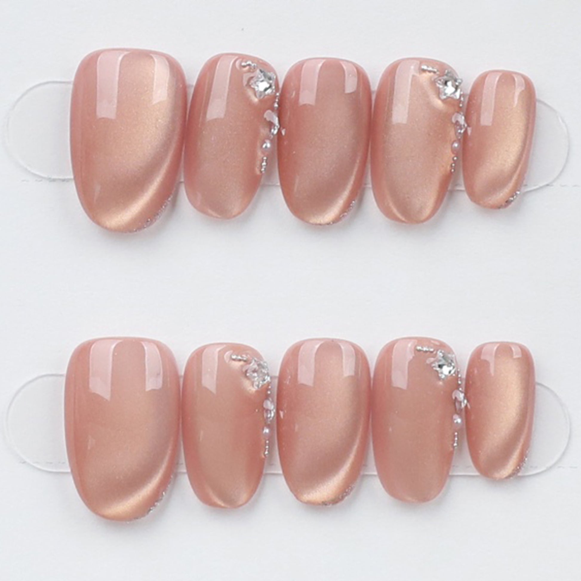 A warm shimmer dances across every nail in this elegant copper-toned press-on set, kissed with delicate silver gem accents. The magnetic sheen and flowing metallic undertones give your fingertips a soft, radiant glow — perfect for any event where subtle glam is a must.