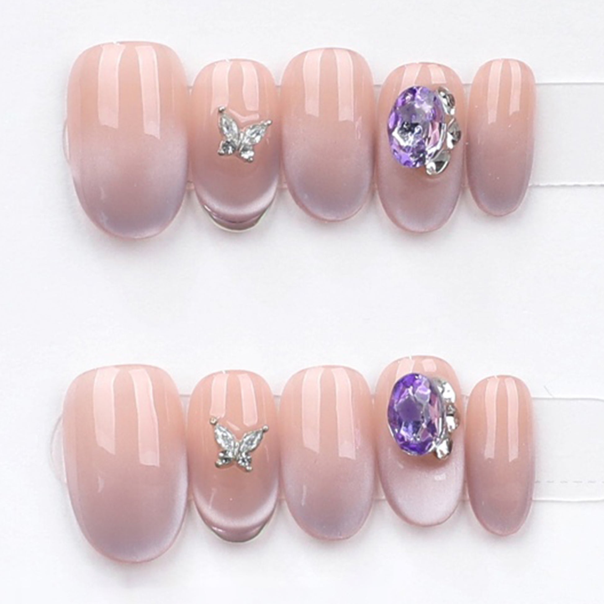 A soft ombré blush base gets a luxe twist with silver butterfly charms and radiant lavender rhinestones. The dreamy gradient blends nude pink with subtle lilac tones, creating a gentle canvas for the sparkle of crystal accents. It’s the perfect harmony of delicate and daring.