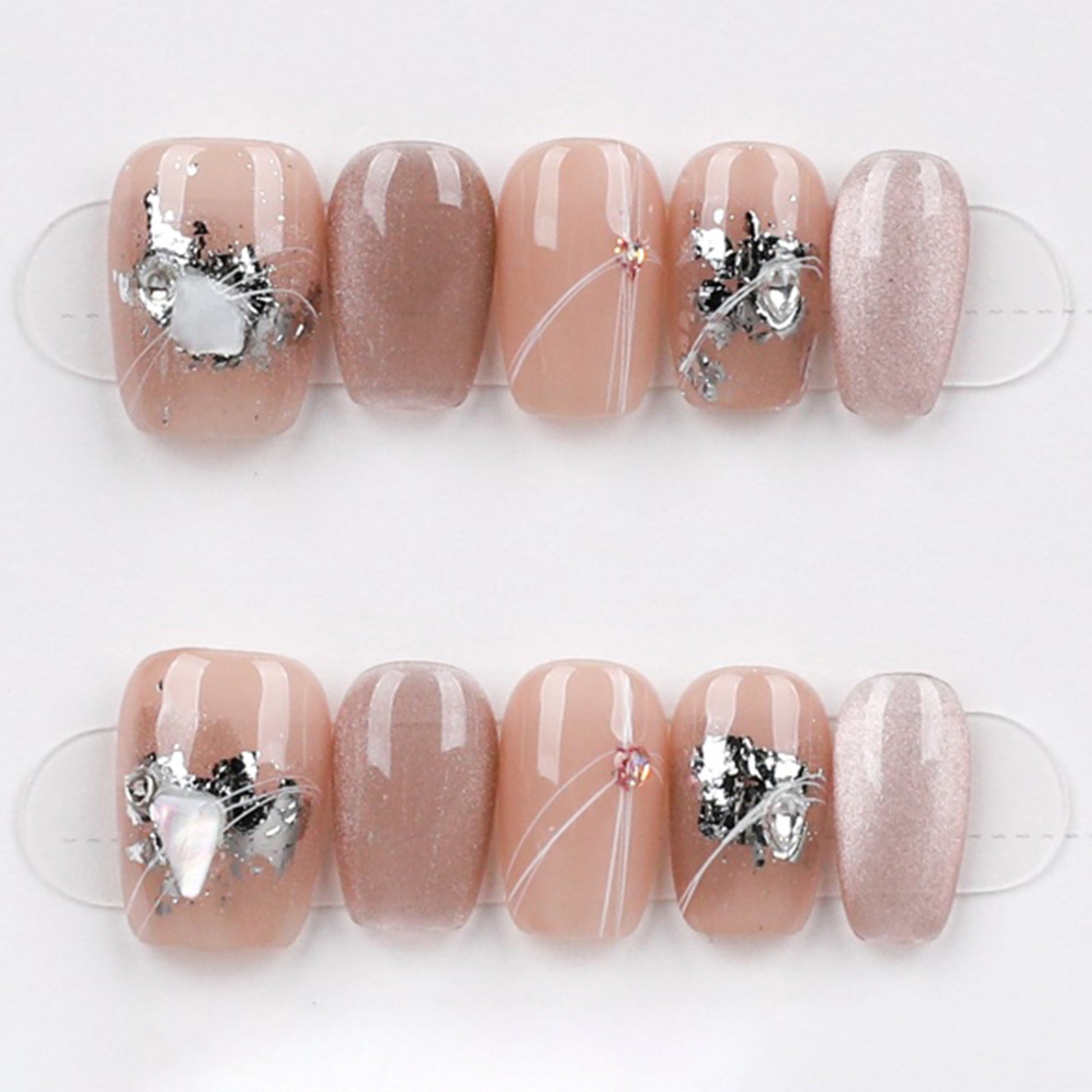 💅 Style Code: L0480-A 🎨 Color: Nude Pink + Pearl Iridescent ✨ Finish: Glossy with Foil & Glitter Details 💎 Shape: Square 📏 Length: Short