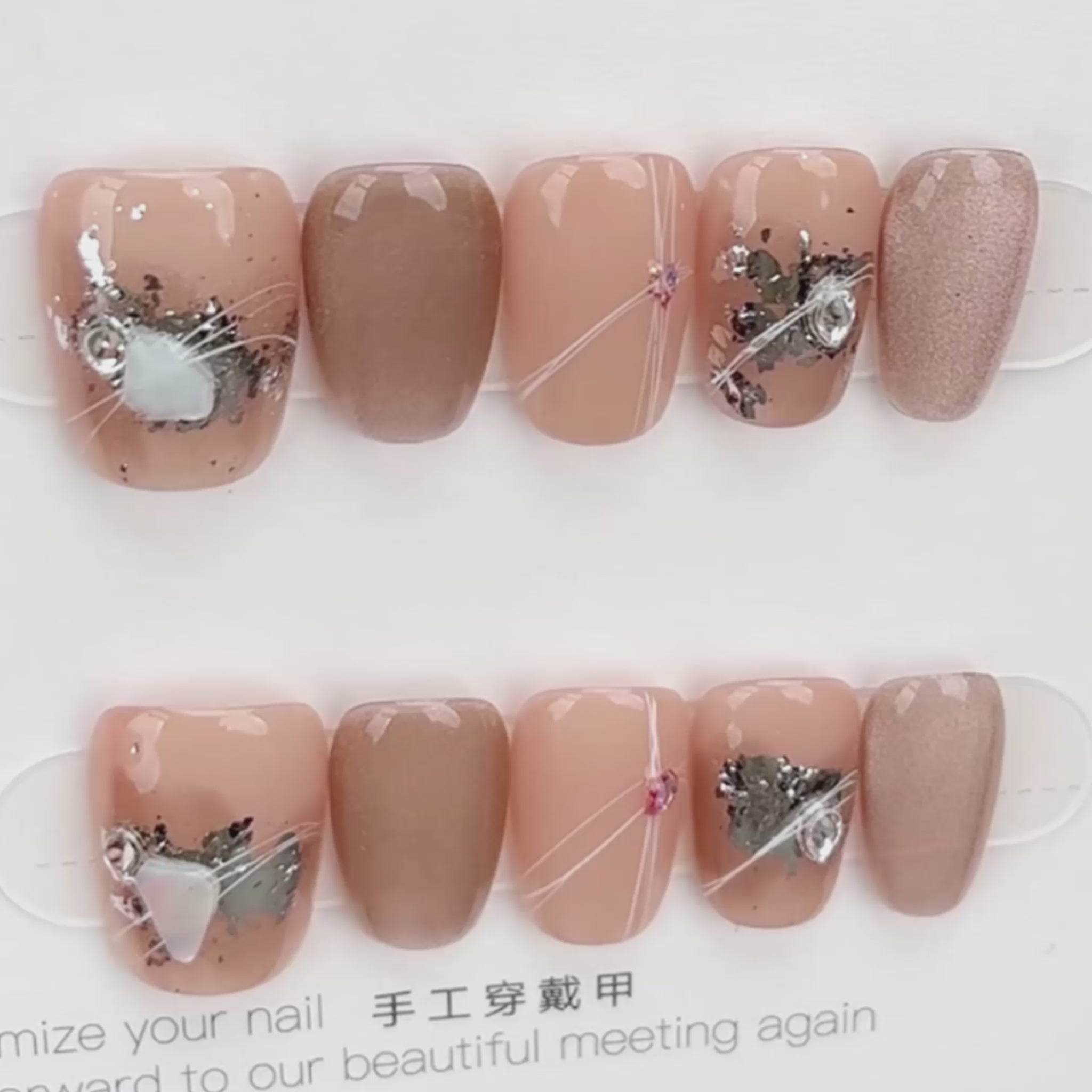 Shimmer with grace in our Gilded Pearl Mosaic Press-On Nail Set. This blend of blush-toned neutrals and soft shimmer captures the elegance of rose gold with a modern twist. Iridescent shell pieces, chrome foil accents, and a glistening top coat create a luxurious, multidimensional look — perfect for weddings, upscale events, or everyday radiance.
