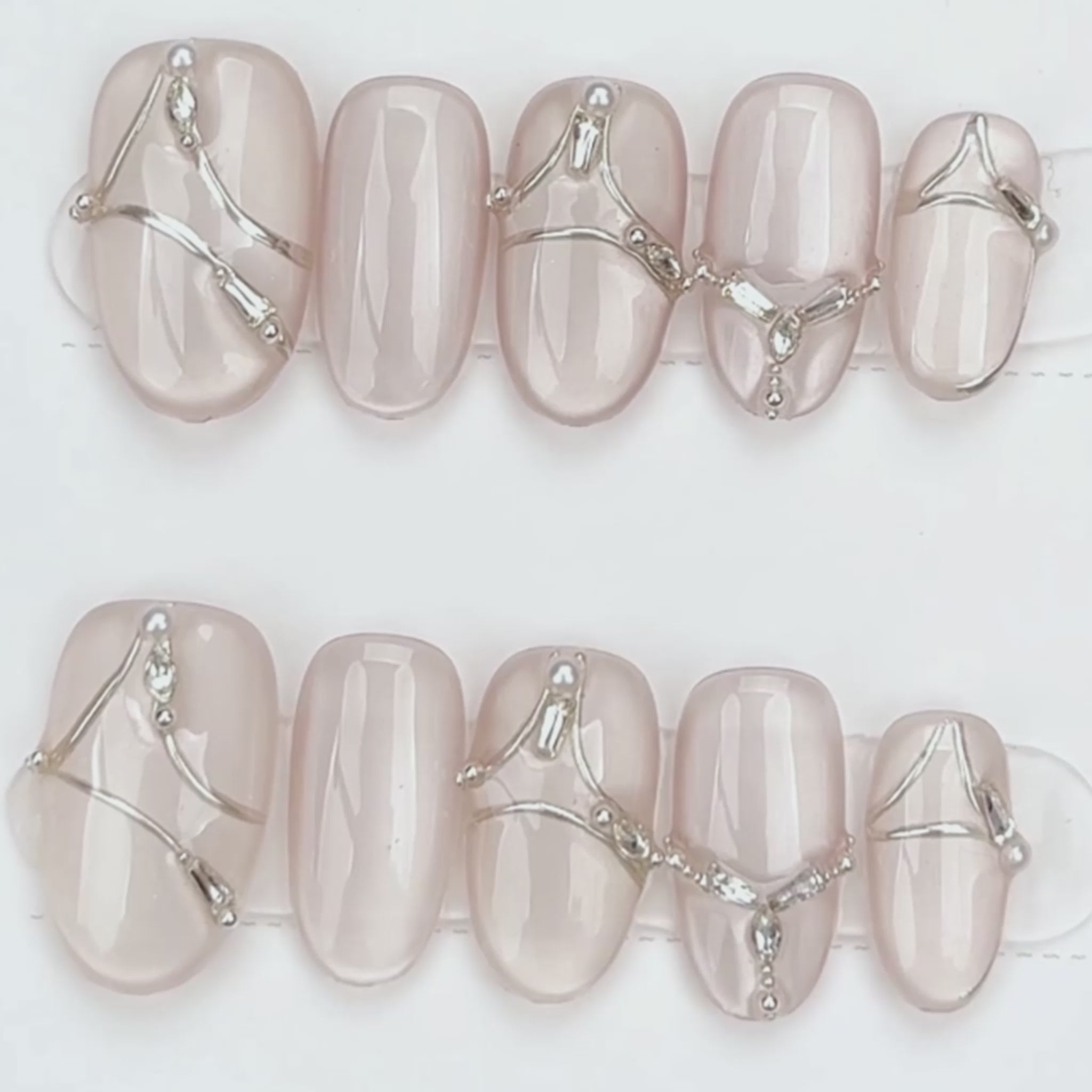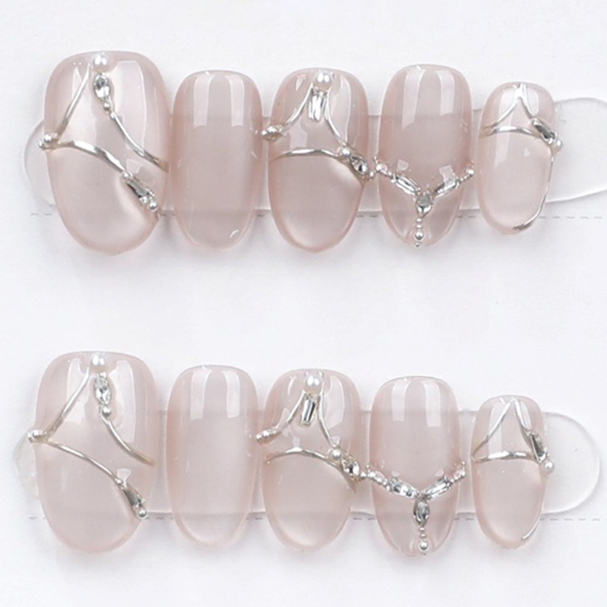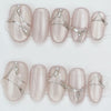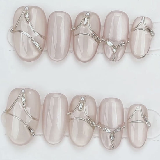 Drape your fingertips in elegance with our Metallic Web Elegance Press-On Nail Set. This stunning nude base is elevated by a soft jelly finish and intricate chrome silver linework that dances across each nail like delicate jewelry. Whether you're heading to a formal event or adding edge to your everyday look, this design is your go-to for effortless sophistication.