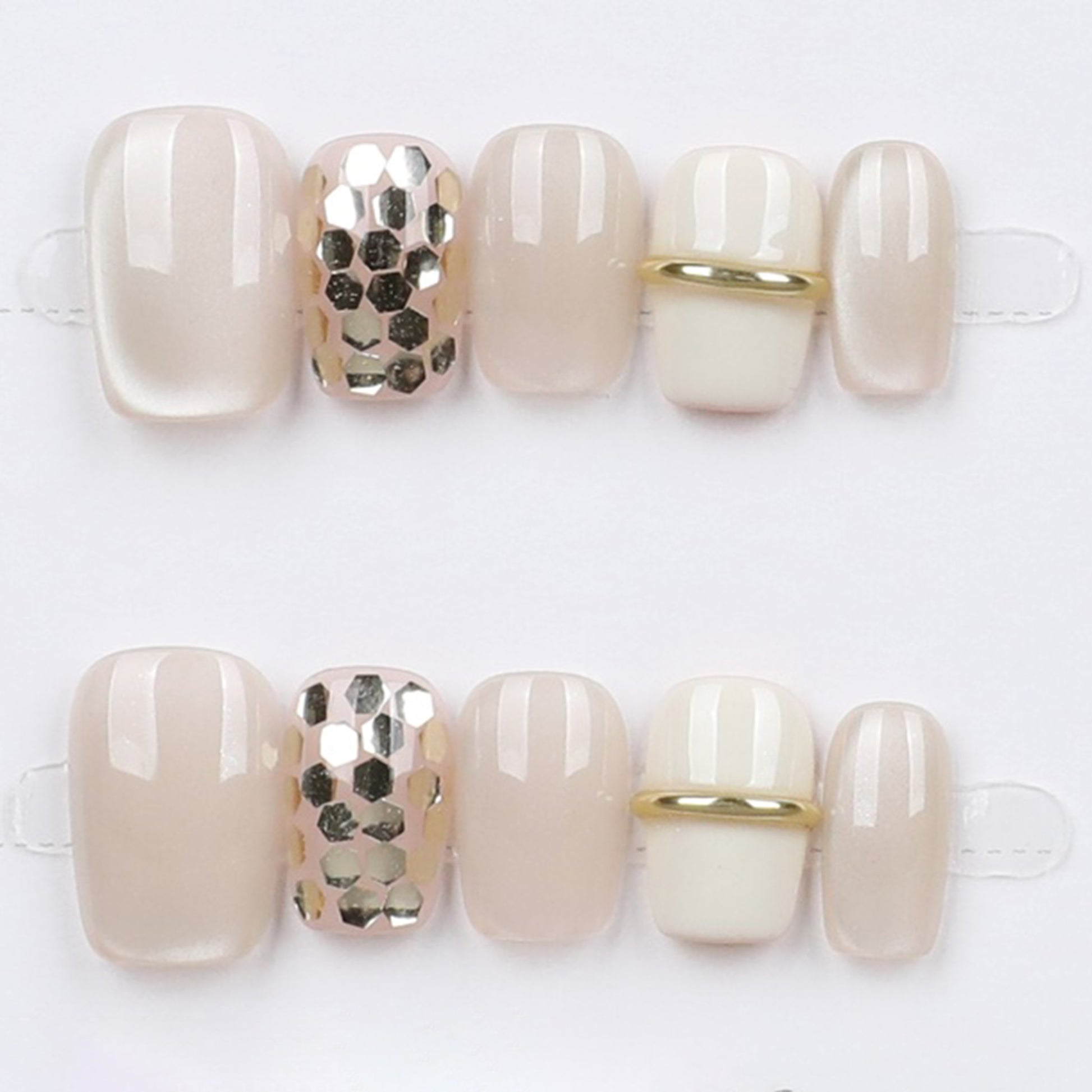 Indulge in soft elegance with our Velvet Rosé Charm Press-On Nail Set. This gorgeous blend of nude-pink tones, honeycomb chrome, and creamy ivory is elevated with a mini gold ring accent for a touch of luxe. It's the perfect blend of minimal and glam for any season.