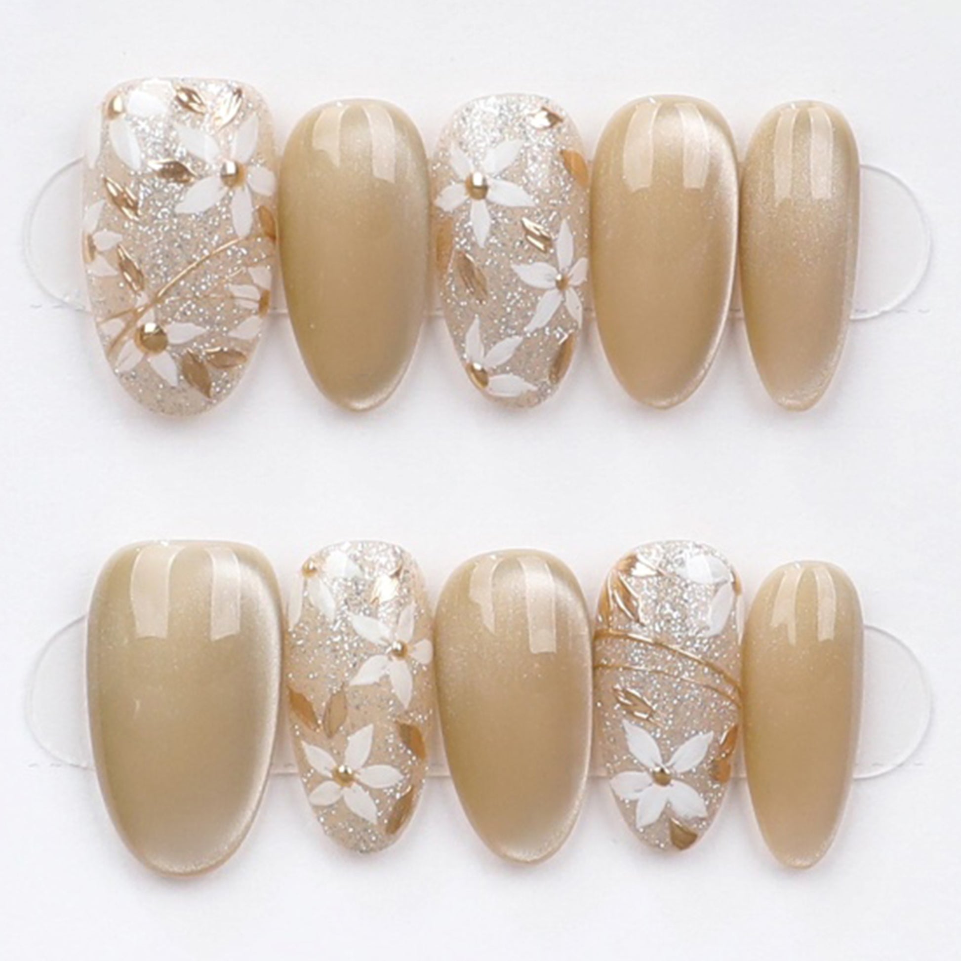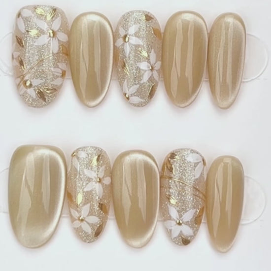An elegant harmony of champagne shimmer, soft gold, and delicate white florals, the Golden Bloom Press-On Nail Set brings refined beauty to your fingertips. Featuring hand-painted blossoms, metallic accents, and a glossy almond shape, this set blends sophistication with a romantic flair — perfect for weddings, formal events, or simply shining a little brighter every day.