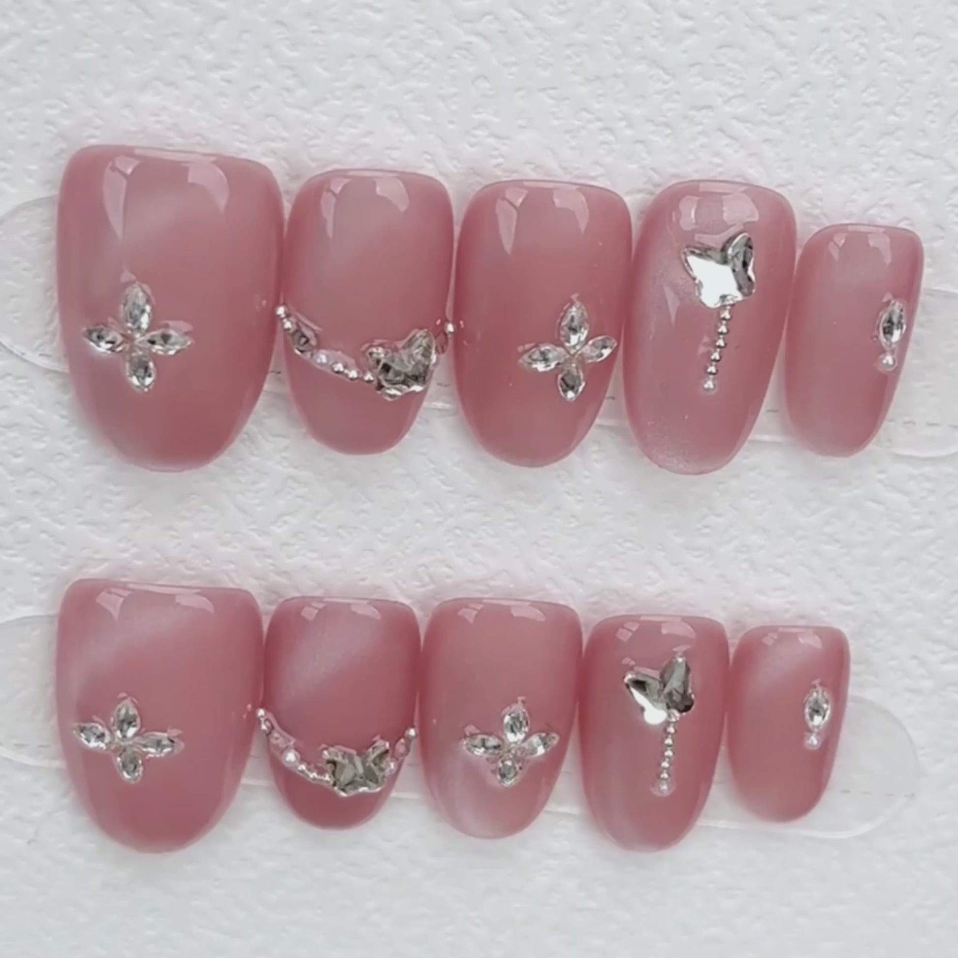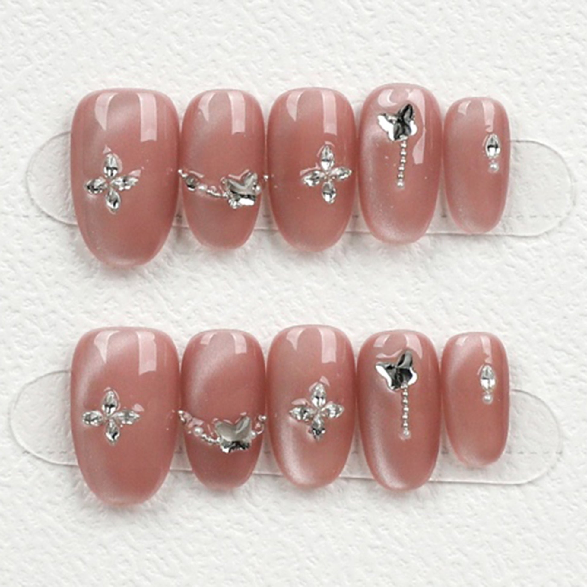 Romantic and ultra-feminine, the Blush Bloom Butterfly Press-On Nail Set combines elegance and whimsy in every detail. A soft mauve-pink base shimmers with a satin glow, adorned with crystal butterflies, florals, and delicate charms. Ideal for weddings, date nights, or everyday beauty with a hint of sparkle.