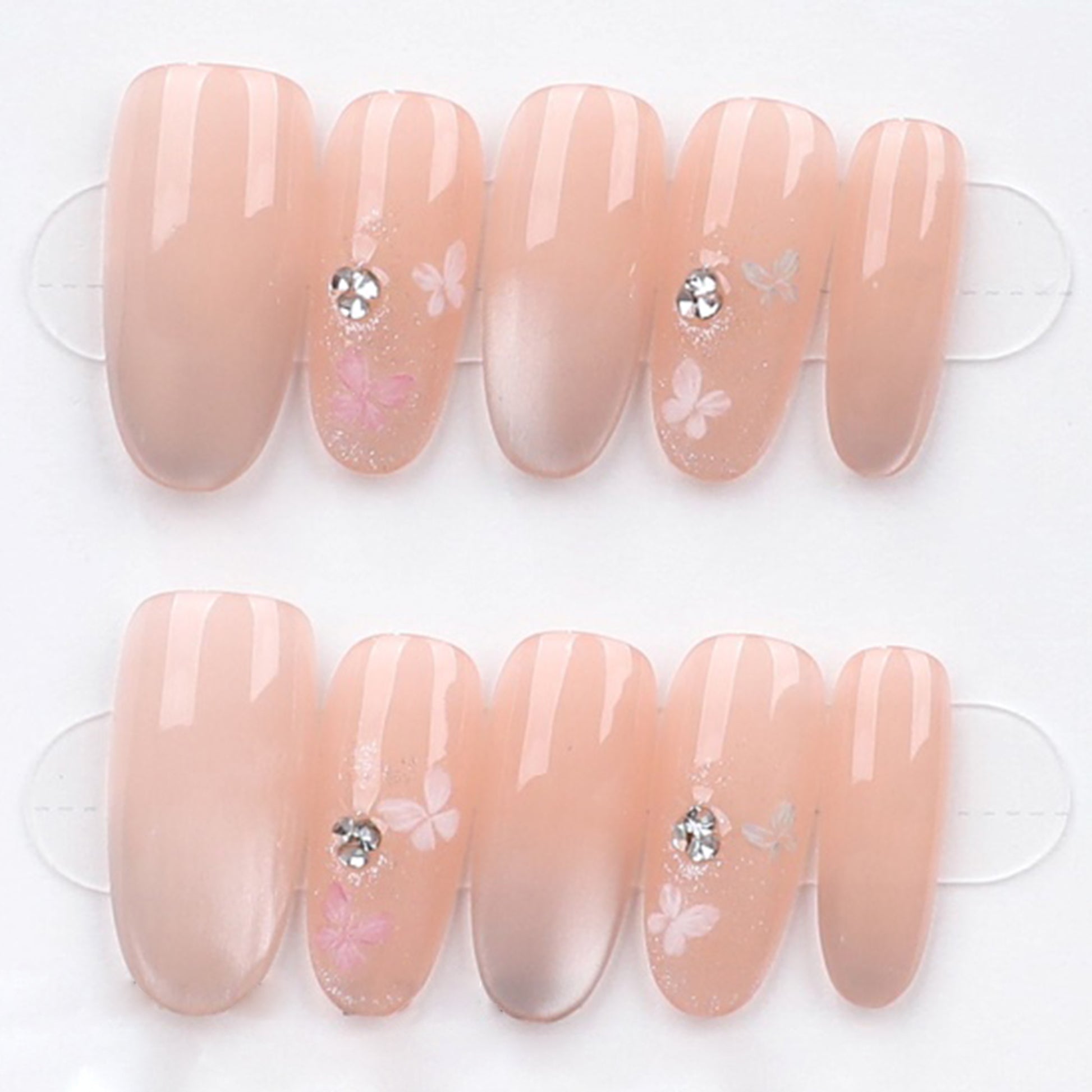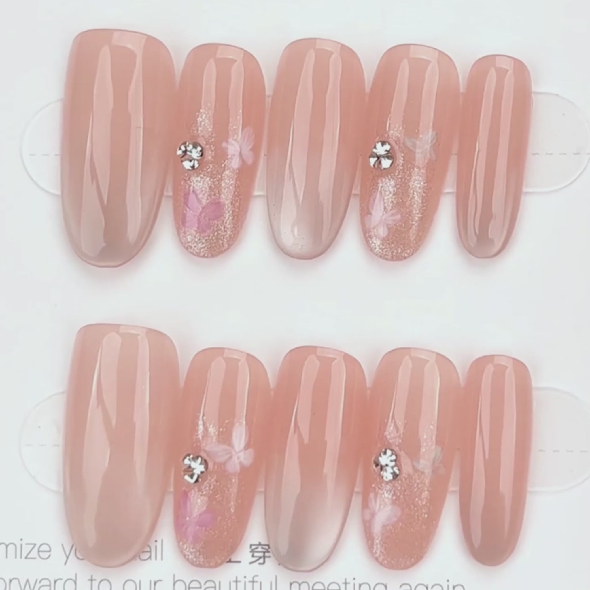 Soft and dreamy, Blush Butterfly Garden Press-On Nail Set blends gentle nude-pink tones with delicate butterfly accents and sparkling rhinestones for a whimsical, romantic finish. The perfect blend of elegance and fantasy, these nails capture the essence of springtime serenity with every flutter.