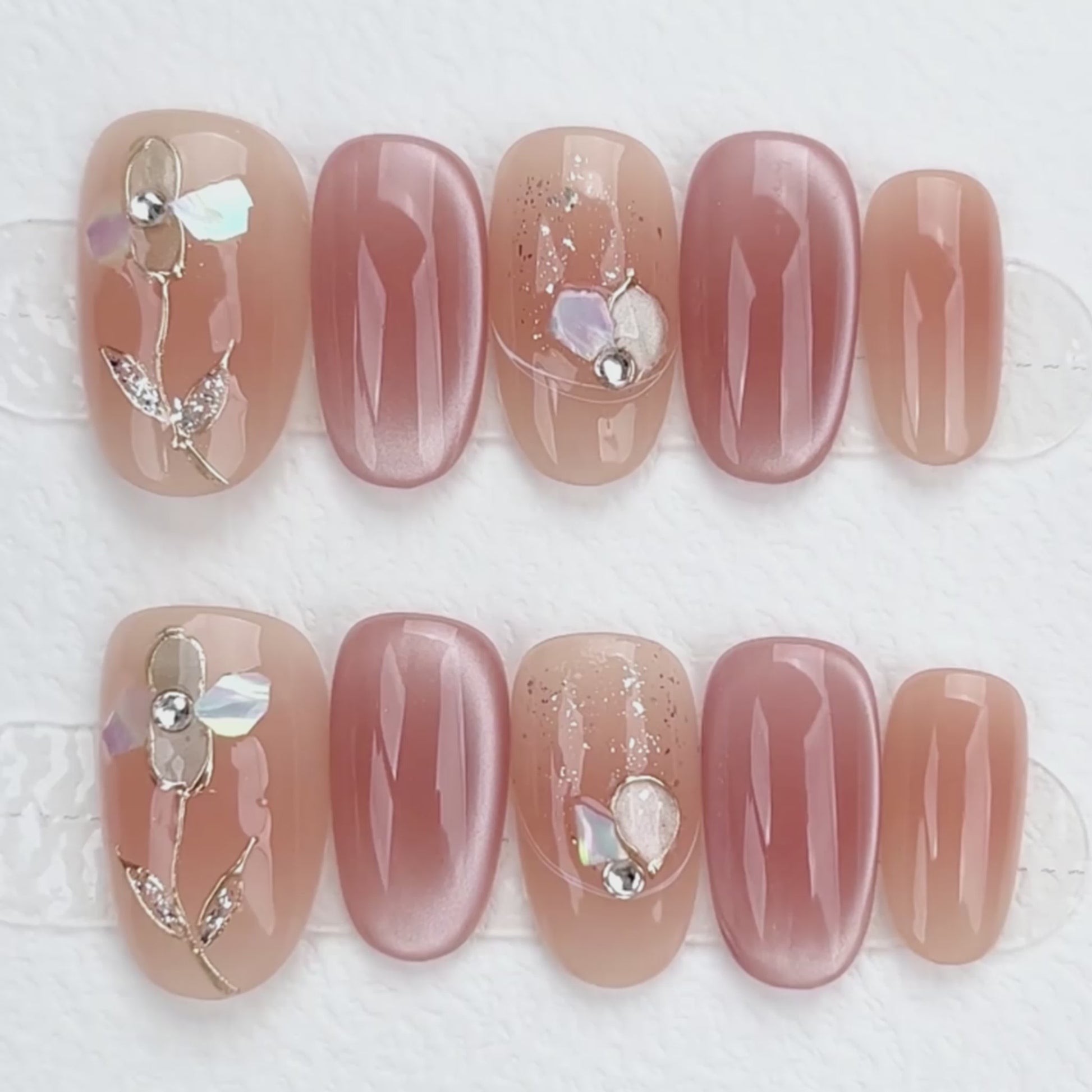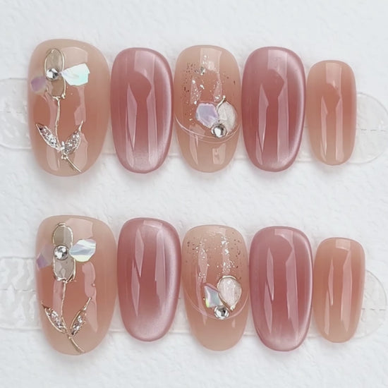 Grace your fingertips with the subtle beauty of the Blushed Rose Blossom Press-On Nail Set. This romantic design features a gradient rose-pink base accented with handcrafted floral appliqués and delicate shimmer details. Touches of silver glitter and mother-of-pearl-like petals add dimension and elegance, making this set perfect for soft glam moments or floral-inspired occasions.
